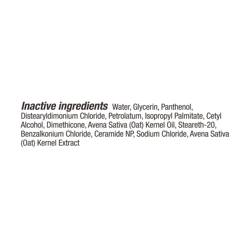 - Inactive Ingredients: Water (aqua), glycerin, panthenol, distearyldimonium chloride, petrolatum, isopropyl palmitate, cetyl alcohol, dimethicone, avena sativa (oat) kernel oil, steareth-20, benzalkonium chloride, ceramide NP, sodium chloride, avena sativa (oat) kernel extract
