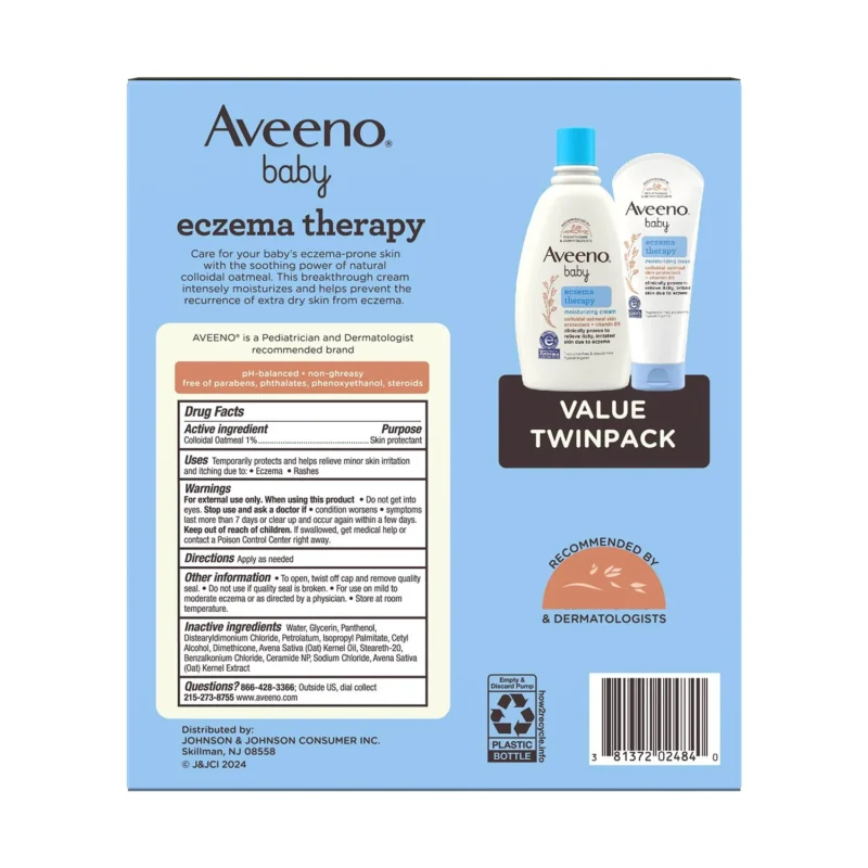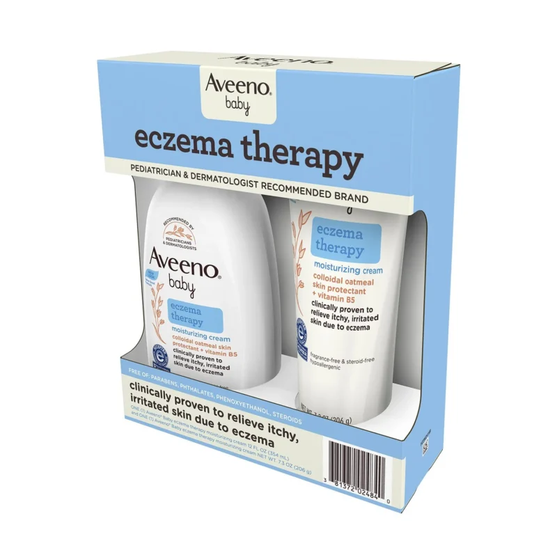 - 12-fluid oz. + 7.3 oz. Aveeno Baby Eczema Therapy Moisturizing Cream to soothe dry, itchy, irritated skin