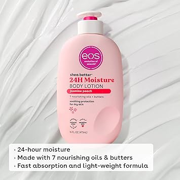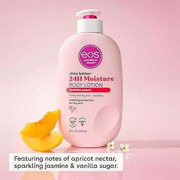 - eos JASMINE PEACH BODY LOTION: Liberally apply eos lotion to just-cleaned skin – we’ll do the rest. Pro tip: Layer this with your favorite fragrance for an enhanced experience