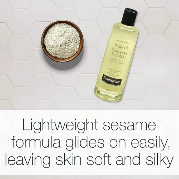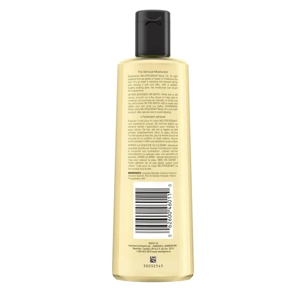 Pamper your skin with NEUTROGENA® Body Oil. This lightweight oil is a delicately light sesame formula that glides on easily to moisturize skin. After a shower or bath while your skin is still damp, smooth on a few drops. It’s so sheer it vanishes into shower damp skin and leaves skin soft and silky with a radiant, healthy-looking glow. In the bath, add to water and soften your skin while you bathe. This body oil comes in a 250-millilitre bottle.